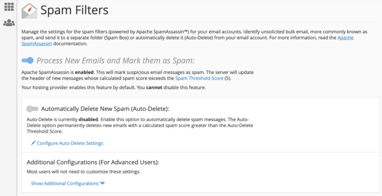 Depending on the settings that your web host allows, you may or may not be able to do much in this section. The spam filters themselves are often on by default and you cannot disable them (like it is in my case). However, you can still fine-tune how the filters work.