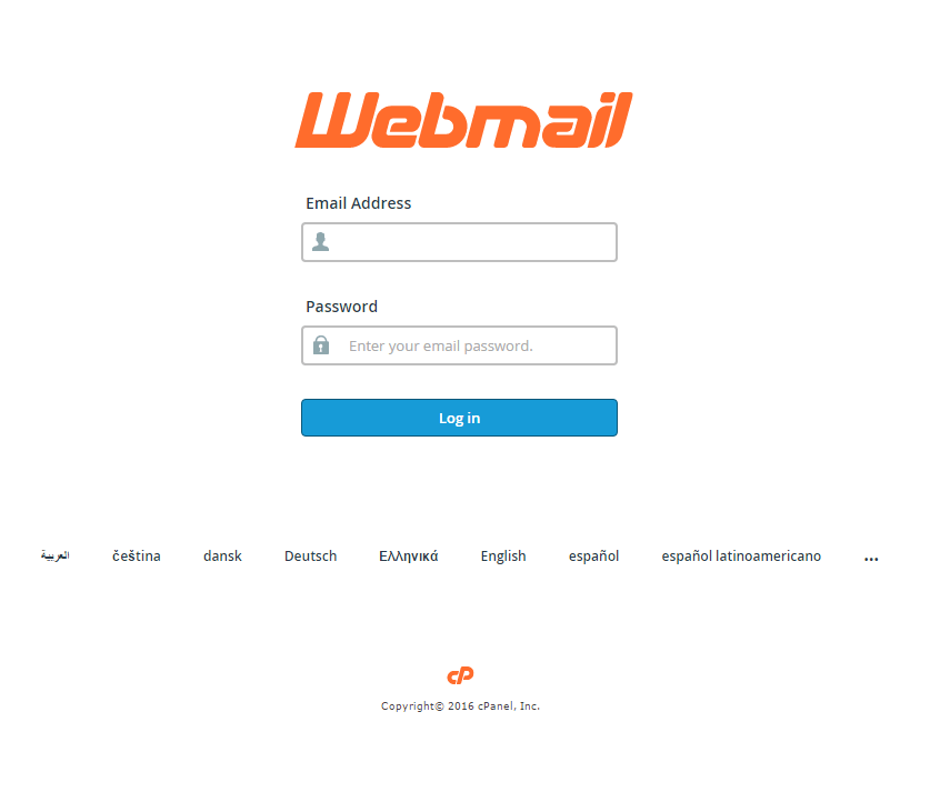 Alternatively, you can access your webmail straight from a web browser. A webmail login button is located on the top right of all of our website pages (simply click on it and you will be taken to the webmail login screen) also, you might simply navigate to http://YOURDOMAIN.com/webmail and you’ll be greeted by the same screen: